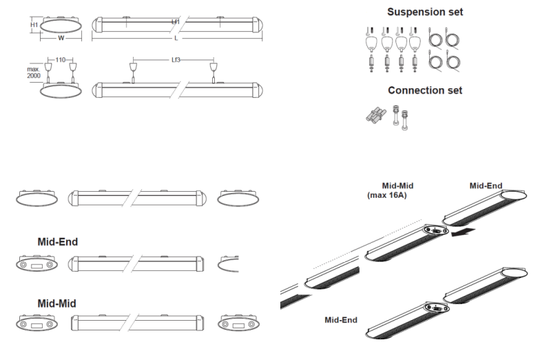 • Optional DALI, MOTION DETECTION, EMERGENCY module, adjustable cable suspension, versione for LED tubes