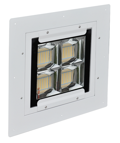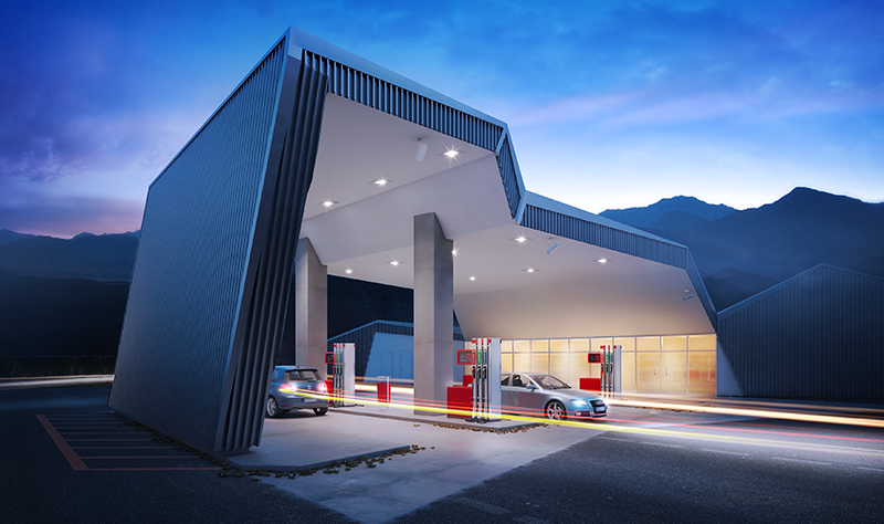 • Modern LED fixture designed for illuminating gas stations